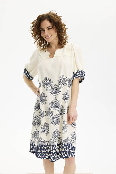 - OBS! Fjernlager. Levering kan blive forlænget med 2-3 dage, hvis varen ikke findes i vores butik lige nu.Sød kjole fra In Front med korte ærmer, rund hals med v-udskæring samt en flot kvalitet og et smukt print.