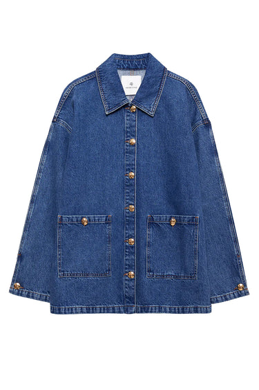 Cool oversized denim jakke fra Anine Bing med lange ærmer, en bred krave i halsen og store lommer på fronten.Jakken har også små slidser i siderne og en flot blå vask.