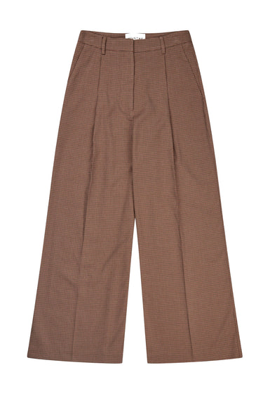 OBS! Fjernlager. Levering kan blive forlænget med 2-3 dage, hvis varen ikke findes i vores butik lige nu.Smukke ternede bukser fra Munthe med brede ben og elegante detaljer såsom bæltestropper, læg og sidelommer. Bukserne lukkes foran med en lynlås.