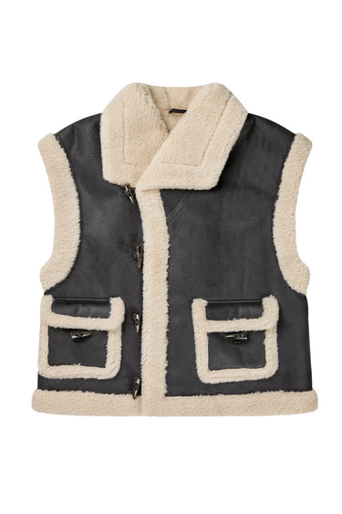 OBS! Fjernlager. Levering kan blive forlænget med 2-3 dage, hvis varen ikke findes i vores butik lige nu.En elegant vest lavet af animal free læder, designet med toggle-lukning og smukke imiterede hornknapper. Vesten er designet med oversized lommer.