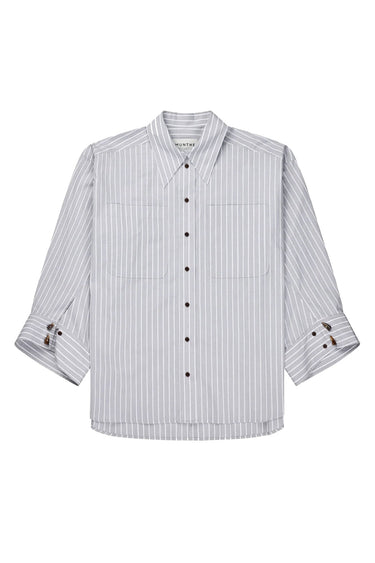 OBS! Fjernlager. Levering kan blive forlænget med 2-3 dage, hvis varen ikke findes i vores butik lige nu.Skjorte med smukke, imiterede hornknapper, elegante striber og brede, smukke manchetter. Skjorten er designet til at være oversize.