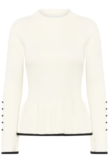OBS! Fjernlager. Levering kan blive forlænget med 2-3 dage, hvis varen ikke findes i vores butik lige nu.Smart strik fra Saint Tropez med lange ærmer, rund hals og et fint lille peplum skørt i bunden. Strikken har også smalle kontrastfarvet kanter og små knapper langs manchetterne.