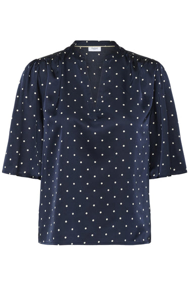OBS! Fjernlager. Levering kan blive forlænget med 2-3 dage, hvis varen ikke findes i vores butik lige nu.Fin bluse fra Saint Tropez med korte ærmer, rund hals med v-udskæring i halsen og et super fint prikket print.