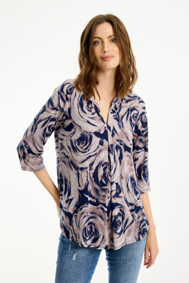 OBS! Fjernlager. Levering kan blive forlænget med 2-3 dage, hvis varen ikke findes i vores butik lige nu.Flot bluse fra In Front med ¾ lange ærmer, rund hals med v-udskæring og et super fint print.