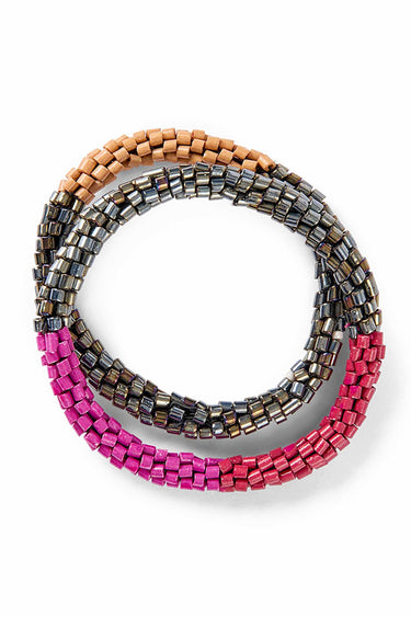 OBS! Fjernlager. Levering kan blive forlænget med 2-3 dage, hvis varen ikke findes i vores butik lige nu.Lad disse to perlearmbånd fra Masai pynte på dit håndled. De elastiske armbånd kombinerer metalliske nuancer med rød, pink og karamel, og de små glasperler gør dem samtidig yderst feminine. Brug armbåndene sammen eller hver for sig.