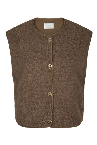 - Skøn teddy vest fra Neo Noir med rund hals, flotte guldknapper langs fronten og en afslappet silhuet.