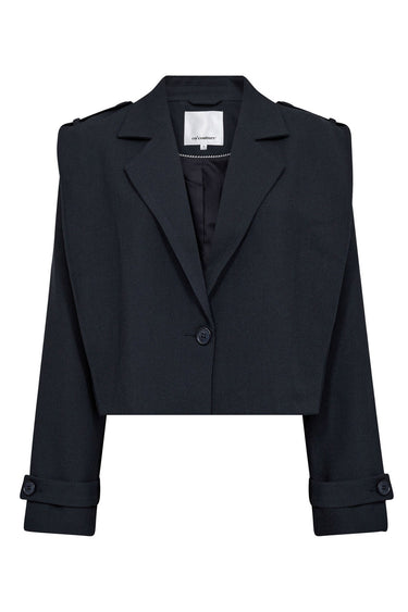 OBS! Fjernlager. Levering kan blive forlænget med 2-3 dage, hvis varen ikke findes i vores butik lige nu.Flot jakke fra Co'couture med lange ærmer, cool remme omkring manchetterne og skulderne samt en klassisk krave og en cropped længde.
