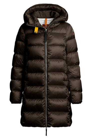 OBS! Fjernlager. Levering kan blive forlænget med 2-3 dage, hvis varen ikke findes i vores butik lige nu.Lang quiltet hættejakke fra Parajumpers, som kombinerer tidløs elegance med moderne funktionalitet. Jakken er fremstillet i vandafvisende polyester-nylon twill med en down-proof coating, hvilket gør den både åndbar og isolerende. Fyldet består af 100 % andedun, der i kombination med en slank (slim) pasform sikrer varme uden at gå på kompromis med silhouette og bevægelsesfrihed. Klassiske Parajumpers-signaturer såsom den gule halsstrop og logo-patch fuldender det særlige udtryk.