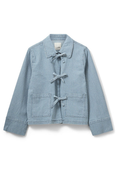 - OBS! Fjernlager. Levering kan blive forlænget med 2-3 dage, hvis varen ikke findes i vores butik lige nu.Smart denim jakke fra Sofie Schnoor med lange og brede ærmer, en lille krave i halsen og smarte sløjfer langs fronten.Jakken har også et klassisk stribet mønster, lommer foran og en super flot broderet detalje på skulderen.