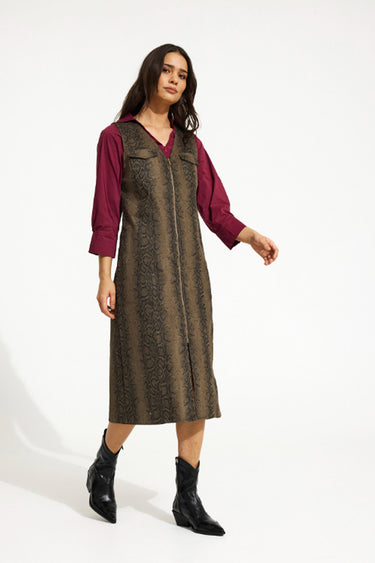 - OBS! Fjernlager. Levering kan blive forlænget med 2-3 dage, hvis varen ikke findes i vores butik lige nu.Flot kjole fra In Front med en fin silhuet, slids i fronten og lommer på brystet.Kjolen har også en lang lynlås foran og et cool imiteret skind print.