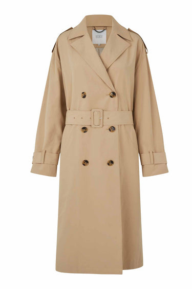 OBS! Fjernlager. Levering kan blive forlænget med 2-3 dage, hvis varen ikke findes i vores butik lige nu.Denne trenchcoat fra Masai er en tidløs garderobeklassiker, du vil elske sæson efter sæson. Det lette stof får frakken til at falde elegant fra skuldrene, mens det brede bælte fremhæver din silhuet på smukkeste vis. Med sit tætsiddende snit, dobbeltradet knaplukning og klassiske revers er denne frakke et stilfuldt valg til hverdagsbrug.