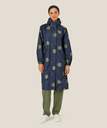 OBS! Fjernlager. Levering kan blive forlænget med 2-3 dage, hvis varen ikke findes i vores butik lige nu.Smart regnjakke fra Masai med lange ærmer, hætte og knaplukning langs fronten.Jakken har også en afslappet silhuet og et fint print med store prikker.