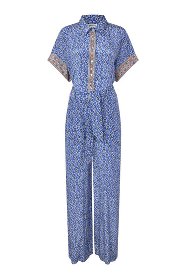 - OBS! Fjernlager. Levering kan blive forlænget med 2-3 dage, hvis varen ikke findes i vores butik lige nu.Moderne og stilfuld jumpsuit fra Lollys Laundry, der kombinerer et levende mønster i blå, hvid og orange med et afslappet, men elegant snit.Jumpsuiten har korte ærmer med fine broderede detaljer på manchetterne og langs knaplukningen på fronten, hvilket giver et unikt, etnisk inspireret præg. Den har en klassisk krave, to brystlommer og et bindebælte i taljen, som fremhæver figuren og skaber en flatterende pasform.