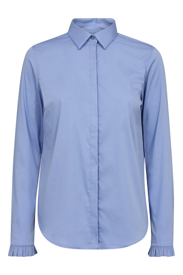 - Feminin skjorte fra Mos Mosh med lange ærmer, en klassisk krave i halsen og fine flæsedetaljer. Skjorten har en let tætsiddende pasform og lukkes med knapper langs fronten.