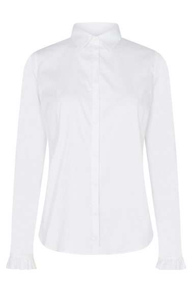 Feminin skjorte fra Mos Mosh med lange ærmer, en klassisk krave i halsen og fine flæsedetaljer. Skjorten har en let tætsiddende pasform og lukkes med knapper langs fronten.