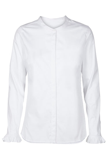 - Smart Skjorte med knakkelukning foran fra Mos Mosh. Skjorten har ingen krave og en lille flæsekant på ærmet.