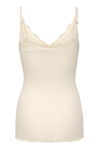 OBS! Fjernlager. Levering kan blive forlænget med 2-3 dage, hvis varen ikke findes i vores butik lige nu.Feminin top fra Saint Tropez med smalle justerbare skulderstropper, en flot blondekant og en lækker blød kvalitet.