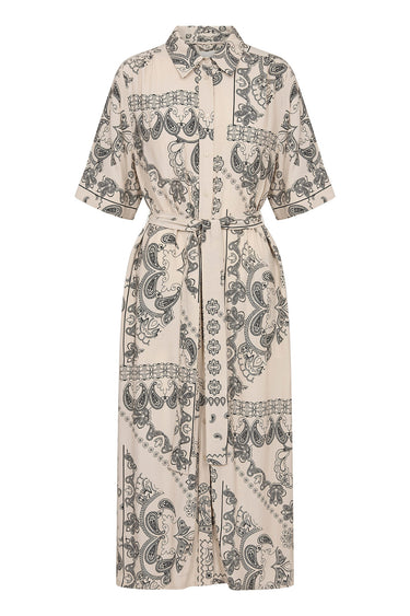 OBS! Fjernlager. Levering kan blive forlænget med 2-3 dage, hvis varen ikke findes i vores butik lige nu.Smuk skjortekjole fra Part Two med ½ lange ærmer, krave i halsen og knaplukning langs fronten.Kjolen har også et bredt bindebælte i taljen.