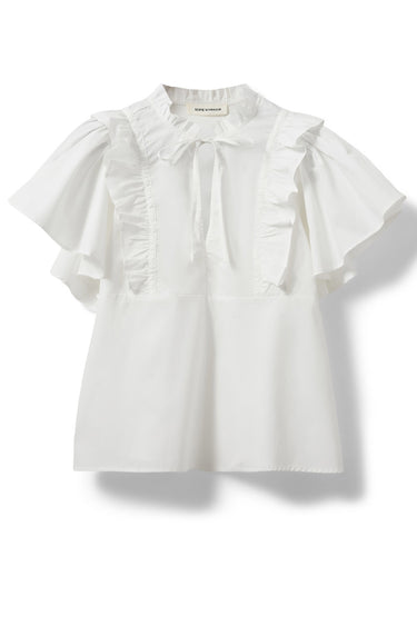 OBS! Fjernlager. Levering kan blive forlænget med 2-3 dage, hvis varen ikke findes i vores butik lige nu.Feminin bluse fra Sofie Schnoor med korte flæseærmer, rund hals med v-udskæring og et smalt bindebånd samt super fine flæsedetaljer og en afslappet silhuet.