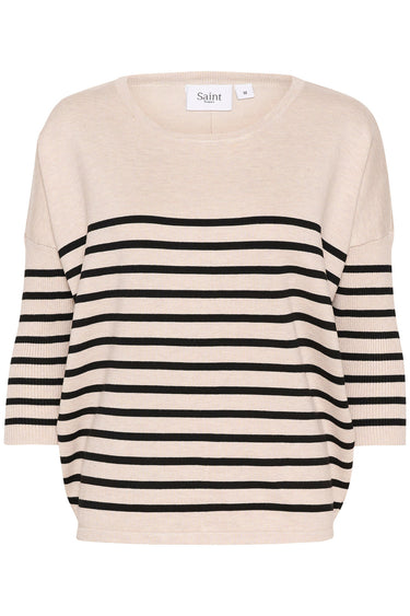 OBS! Fjernlager. Levering kan blive forlænget med 2-3 dage, hvis varen ikke findes i vores butik lige nu.Smart oversized strik fra Saint Tropez med ¾ lange ærmer, bådudskæring i halsen og et klassisk stribet mønster.