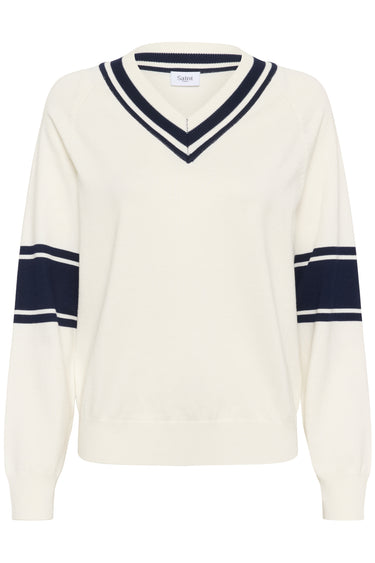 OBS! Fjernlager. Levering kan blive forlænget med 2-3 dage, hvis varen ikke findes i vores butik lige nu.Sporty strik fra Saint Tropez med lange ærmer, v-udskæring i halsen og et flot mønster.