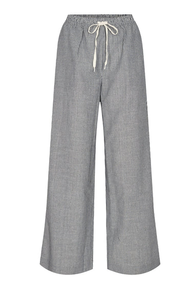 OBS! Fjernlager. Levering kan blive forlænget med 2-3 dage, hvis varen ikke findes i vores butik lige nu.Smarte bukser fra Co'couture med en bred elastikkant og bindebånd i taljen, vidde i benene og et fint stribet print.