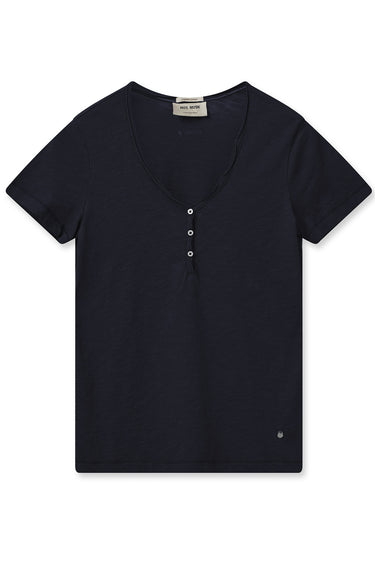 Fin t-shirt fra Mos Mosh med korte ærmer, v-udskæring i halsen og små knapper over brystet.