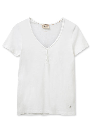 Fin t-shirt fra Mos Mosh med korte ærmer, v-udskæring i halsen og små knapper over brystet.