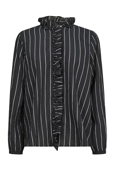 Elegant skjortebluse fra Mos Mosh med lange ærmer, skjult knaplukning langs fronten og de flotteste flæsedetaljer. Blusen har også en afslappet silhuet og et fint stribet print.