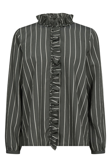 Elegant skjortebluse fra Mos Mosh med lange ærmer, skjult knaplukning langs fronten og de flotteste flæsedetaljer. Blusen har også en afslappet silhuet og et fint stribet print.