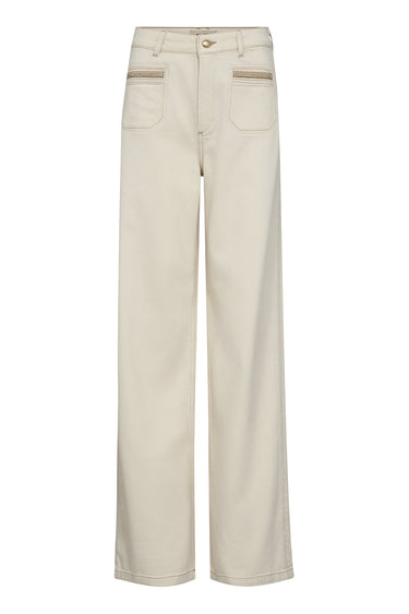 - Smarte lyse jeans fra Mos Mosh, som skaber den perfekte harmoni mellem komfort og elegance. De har en flatterende høj talje og en wide-leg-silhuet med kontrastsyninger og lommer foran med gulddetaljer for lidt ekstra hverdagsglamour. Brug dem sammen med vores matchende jakke eller en lys strik for et poleret og stilfuldt look.