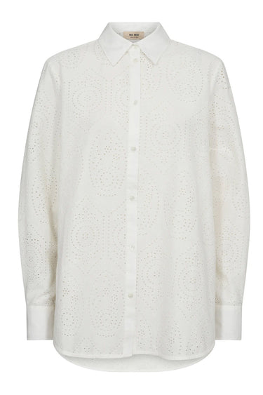 Elegant broderi anglaise fra Mos Mosh med lange ærmer, krave i halsen og knaplukning langs fronten.