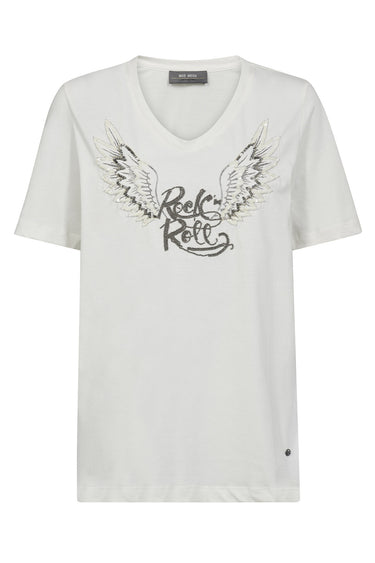 - Smart tee fra Mos Mosh med korte ærmer, v-udskæring i halsen og et smukt motiv på brystet der er detaljeret med broderi og perler.