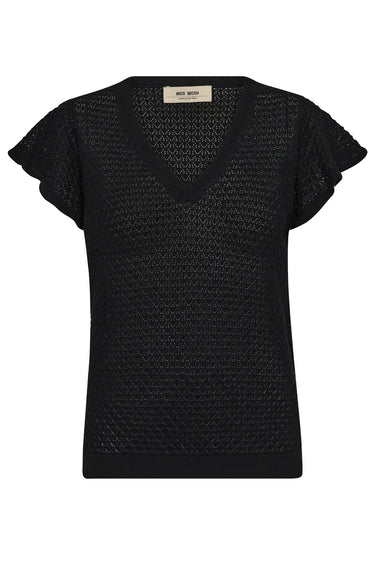 Denne smukke striktop fra Mos Mosh må du bare have i din garderobe. Den er fremstillet i økologisk bomuld med et charmerende gennembrudt design. Den har en regulær pasform, flatterende V-hals og flæseærmer som finish. En alsidig strik, der både passer til tailored bukser og denim.