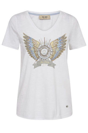 - Cool T-shirt fra Mos Mosh i en tætsiddende pasform med et charmerende vinge- og tekstmotiv i håndlavede perler og broderi. Brug den til denim for et afslappet look eller et tailored jakkesæt for en cool, men stilfuld kontrast.