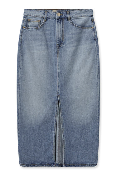 Cool denim nederdel fra Mos Mosh med et klassisk snit, slids i fronten og klassiske lommer.