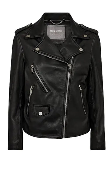 Cool bikerjakke fra Mos Mosh med lange ærmer, en bred krave i halsen og de flotteste lynlåsdetaljer der giver jakken et råt udtryk.Den lukkes i fronten med en klassisk asymmetrisk lynlås.