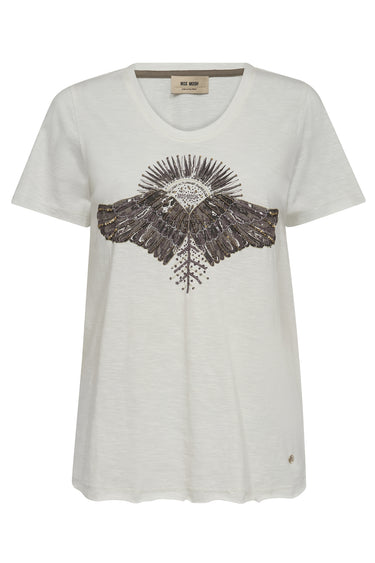 Flot tee fra Mos Mosh med korte ærmer, rund hals og et super flot print med pailletter og perler på brystet.