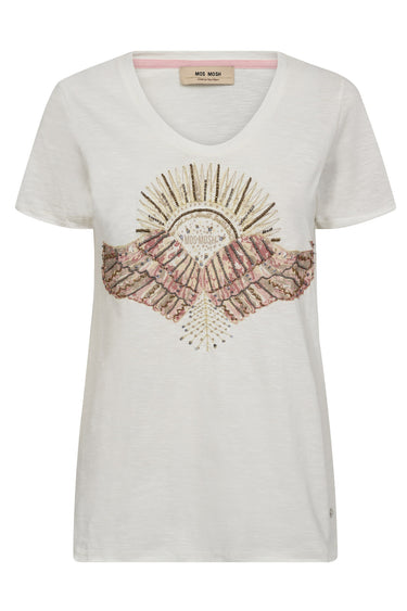 Flot tee fra Mos Mosh med korte ærmer, rund hals og et super flot print med pailletter og perler på brystet.