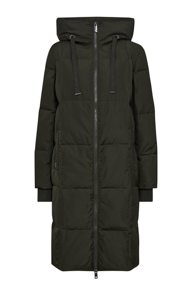 Dejlig varm lang dunjakke fra Mos Mosh. Jakken har en lækker lige pasform, lukkes med kraftig dobbelt lynlås, den har to lommer på fronten og en skøn hætte med snøre.