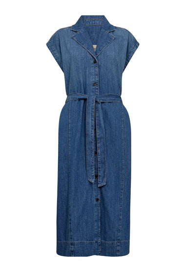 - Flot denim kjole fra Mos Mosh med små ærmer, en fin krave i halsen og knaplukning langs fronten.Kjolen har også en flot silhuet, et bredt bindebælte i taljen og en lækker bomuldskvalitet.