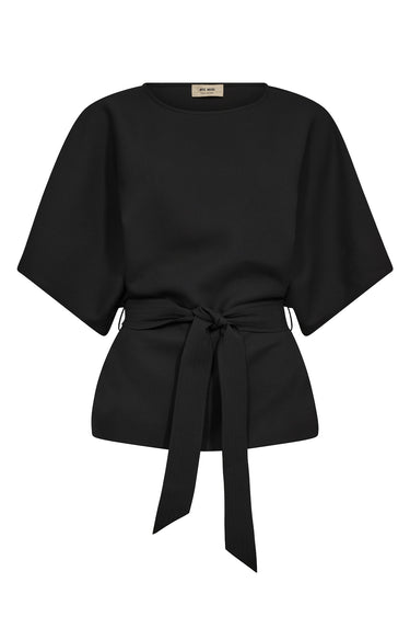 Elegant bluse fra Mos Mosh med korte ærmer, bådudskæring i halsen og et bredt bindebælte i taljen.