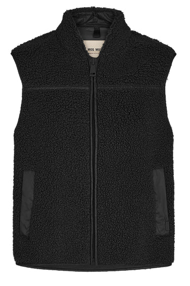 Blød og lækker teddy vest fra Mos Mosh med stiklommer i siderne, høj krave i og lynlåslukning langs fronten.