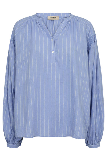 - Fin bluse fra Mos Mosh med en afslappet silhuet, et kort knappanel over brystet og et klassisk stribet print med diskrete glimmereffekter.