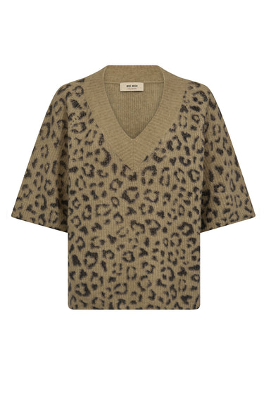 OBS! Fjernlager. Levering kan blive forlænget med 2-3 dage, hvis varen ikke findes i vores butik lige nu.Denne strikkede T-shirt har en afslappet silhuet, der sikrer komfort hele dagen med en stilfuld kant. Det dristige leopardprint og V-halsdesign tilføjer et strejf af moderne raffinement.