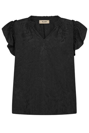 Elegant bluse fra Mos Mosh med korte flæseærmer, v-udskæring i halsen og den flotteste tone-i-tone jacquard kvalitet.