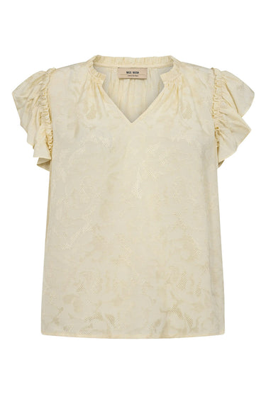 Elegant bluse fra Mos Mosh med korte flæseærmer, v-udskæring i halsen og den flotteste tone-i-tone jacquard kvalitet.