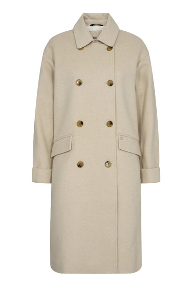 Flot frakke fra Mos Mosh med lange ærmer, en lille krave i halsen og lommeflapper i siderne.Frakken har også en afslappet pasform og lukkes med flotte knapper langs fronten.