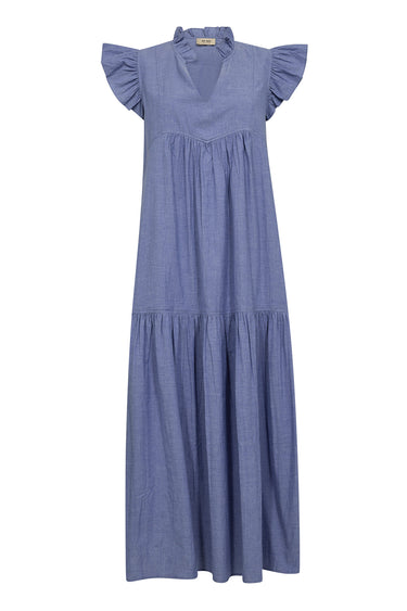 Feminin kjole fra Mos Mosh med små flæseærmer, v-udskæring i halsen og en behagelig afslappet silhuet med skønne brede flæser i bunden.