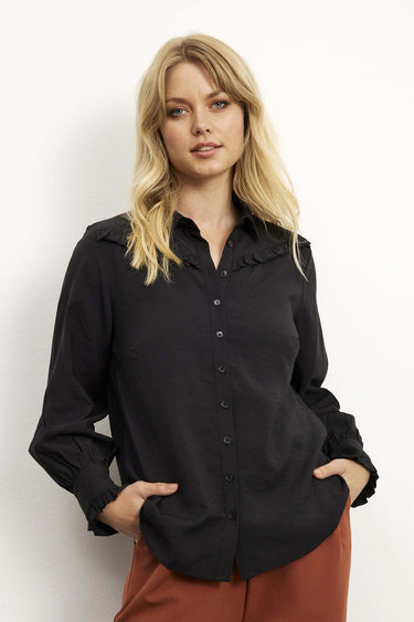 OBS! Fjernlager. Levering kan blive forlænget med 2-3 dage, hvis varen ikke findes i vores butik lige nu.Fin enkel skjortebluse fra In Front med lange ærmer, skjortekrave i halsen og fine små flæsedetaljer over skulderne og i bunden af ærmerne.Blusen lukkes også langs fronten med små knapper.